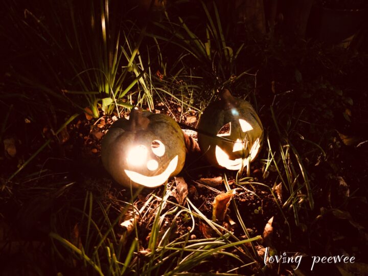 孫たちが出かけている間に、お庭のカボチャにキャンドルを灯して・・・