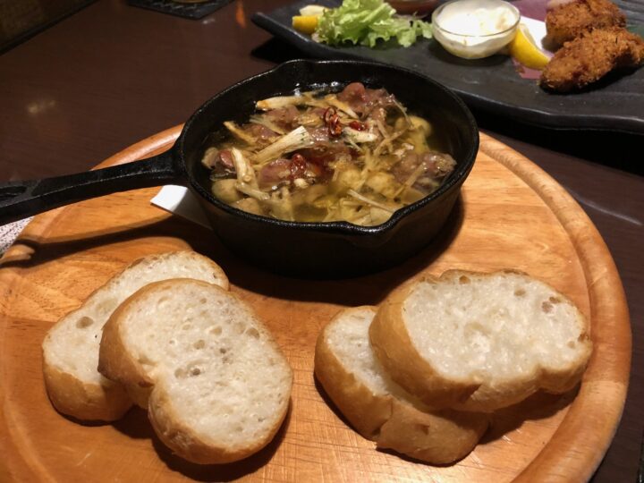 砂肝とキノコのアヒージョ。