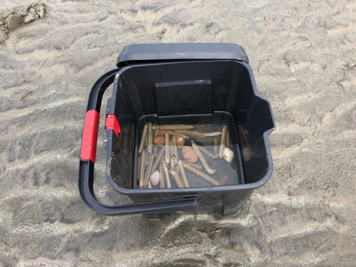 持ち帰る時は、バケツの中で砂を洗い、ザルに入れてからもう一度バケツに海水を入れて持ち帰ると砂が抜けやすいです。