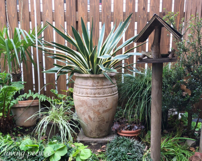 大きなつぼ型の植木鉢にユッカ グロリオサバリエガータを入れました。