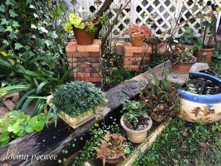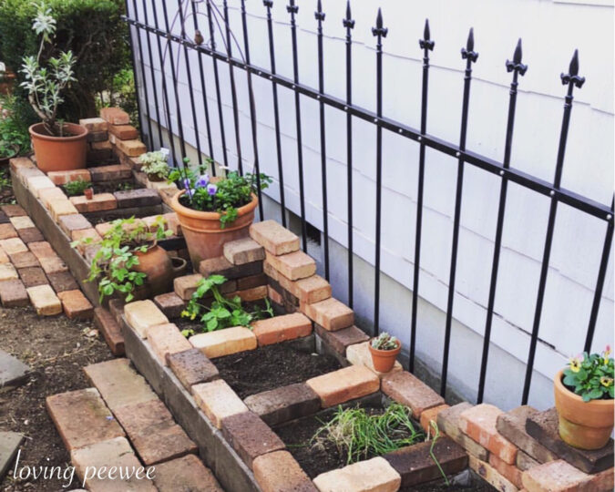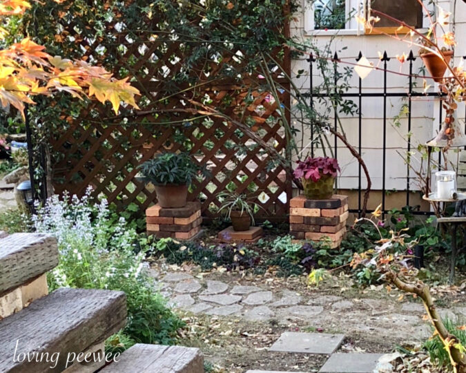 画像の中のレンガを積んだ鉢台も、ブロックの花壇と同じようにお気に入りです。