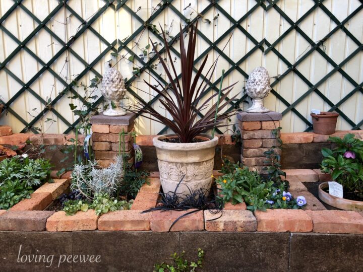 レンガを積んだ花台にのせたピンクダブル(ホワイトグリーンピコティー)